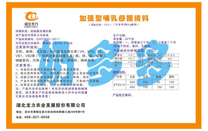 湖北龍力農(nóng)業(yè)發(fā)展股份有限公司坐落于武漢市黃陂區(qū)前川街向陽街群順三里298號附1號。公司成立于2014年6月,公司自成立以來把“創(chuàng)全球最大養(yǎng)豬綜合服務”為企業(yè)愿景。致力于打造教保料品牌”作為公司發(fā)展的明確目標。公司一直致力于豬營養(yǎng)的研究和開發(fā),積極與國內(nèi)外高校和科研機構(gòu)合作,推廣養(yǎng)豬技術(shù)、動物營養(yǎng)新概念,向世界農(nóng)牧企業(yè)學習與合作。公司采用國內(nèi)先進的生產(chǎn)工藝,選擇高精度電子配料秤,高均勻度、無殘留混合機等先進設(shè)備....